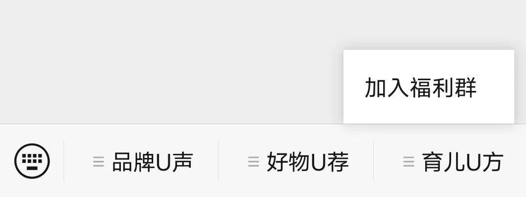 公众号菜单栏「育儿U方」——点击子菜单「加入福利群」——弹出福利群海报——扫码添加海报上的优妈企微——优妈邀请入群。