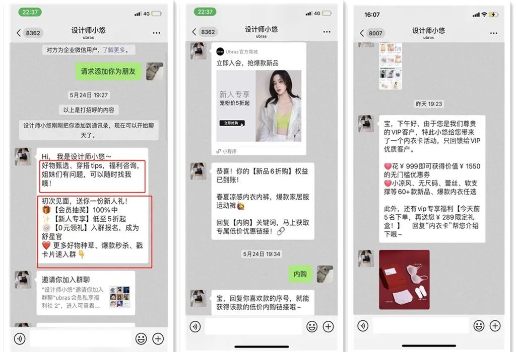 4)设计师小悠除了添加好友有私聊话术,还会有其他福利或者VIP活动的私聊行为,这个做法很好的把品牌的福利活动推送给用户,完成首单转化或者复购,提升品牌GMV。