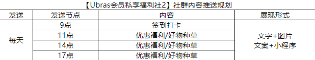 Ubras的社群主要以签到打卡、推送福利优惠和好物种草为主,虽然新人进群都会发送社群欢迎语,表明社群的作用,其中就有内衣干货知识和互动抽奖小游戏,但是社群没有做这个的动作;社群的目的旨在触达营销,促成社群用户的付费转化和持续复购,提升品牌GMV。