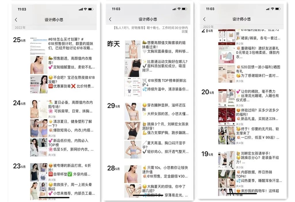 1)朋友圈的内容基本100%为好物推荐和福利促销的用户种草营销内容,符合设计师小悠的好物推荐的福利官人设,但是广告过硬,缺少温度,比较营销化。
