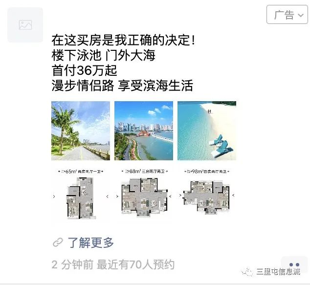 拿房产行业的创意来说,素材类型上一般都会以原生的四六图为主,大图卡片为辅。针对不同需求的楼盘项目,可以对应调整外层素材策略,同时根据自身投放需求,选择不同类型的文案,如: