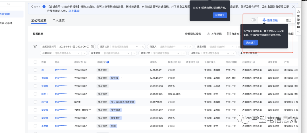 虽然解决了线索分配的问题,但我们仍旧难以全面地去了解每个客服或销售的跟进程度,发现他们在跟进中所产生的问题,毕竟线索有效性一般都由他们进行主观上的判断,同时他们使用的话术以及表达的专业度极易影响客户的判断,从而影响线索的有效性。这就需要团队定期对线索跟进监管和复盘。