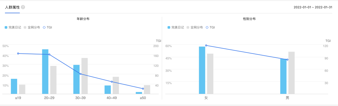 完美日记目标人群集中在20-29岁,从性别分析中可以看出,主要受众为女性,占比在45%-60%之间,男性占比也高达40%,相比于过往观念女性是美妆主要受众,现今男性也成了不可忽视的一个顾客群体。