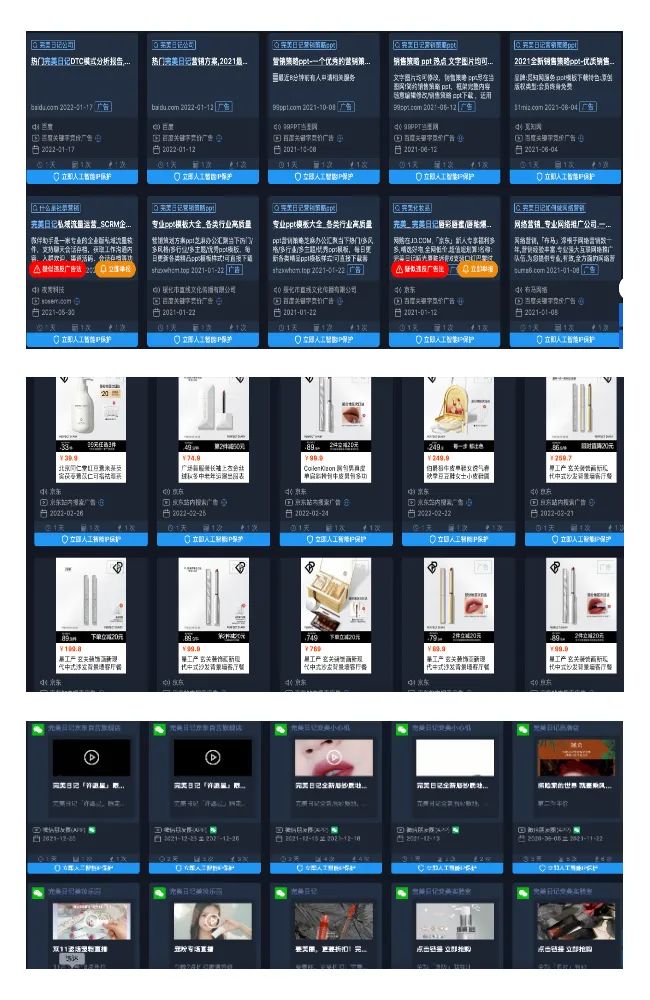多为单个爆款产品投放,图多为简单的产品图,优惠信息较为明显,标题除了产品名外会补充产品功效、描述等,会增加礼物、生日礼物、情人节礼物等字样的关键词,该产品除了女孩子自己会购买以外,作为礼物被送给女孩子的情况也很多;