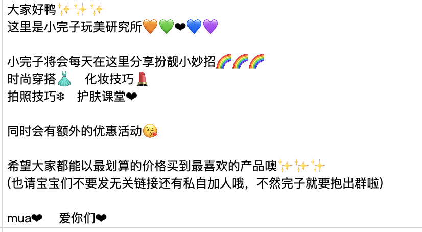 完美日记其实有很多种群,像是我加的完美研究所,以护肤品为主,但是我想加的其实是以彩妆为主的群,但是前期是不知道有这么多群的,这就会让人摸不着头脑,明明是个美妆牌子为什么还卖护肤品?官方平台未有过护肤品露出。