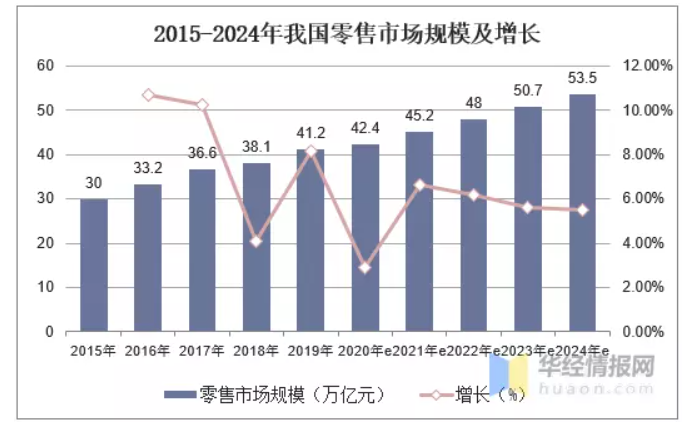 2015-2024年我国零售市场规模及增长: