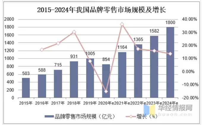 2015-2024年我国品牌零售市场规模及增长: