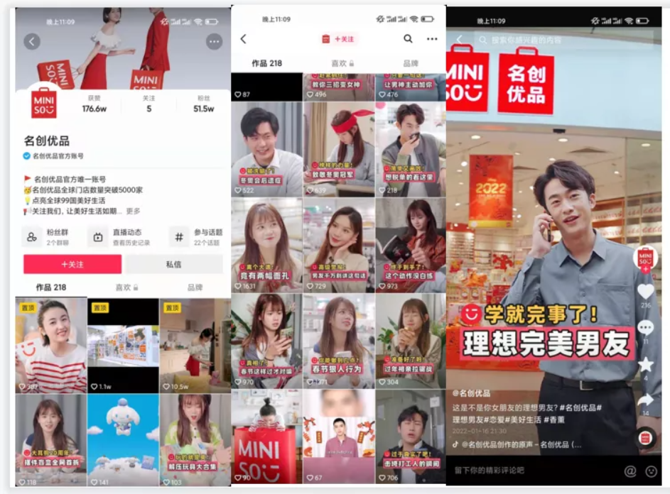 名创优品的官方账号的视频内容主要是门店真人出镜+场景化主题带货的形式,视频点赞量在200左右,爆款视频数据也能在10w+,以及一小部分的品牌宣传内容,如代言人等。