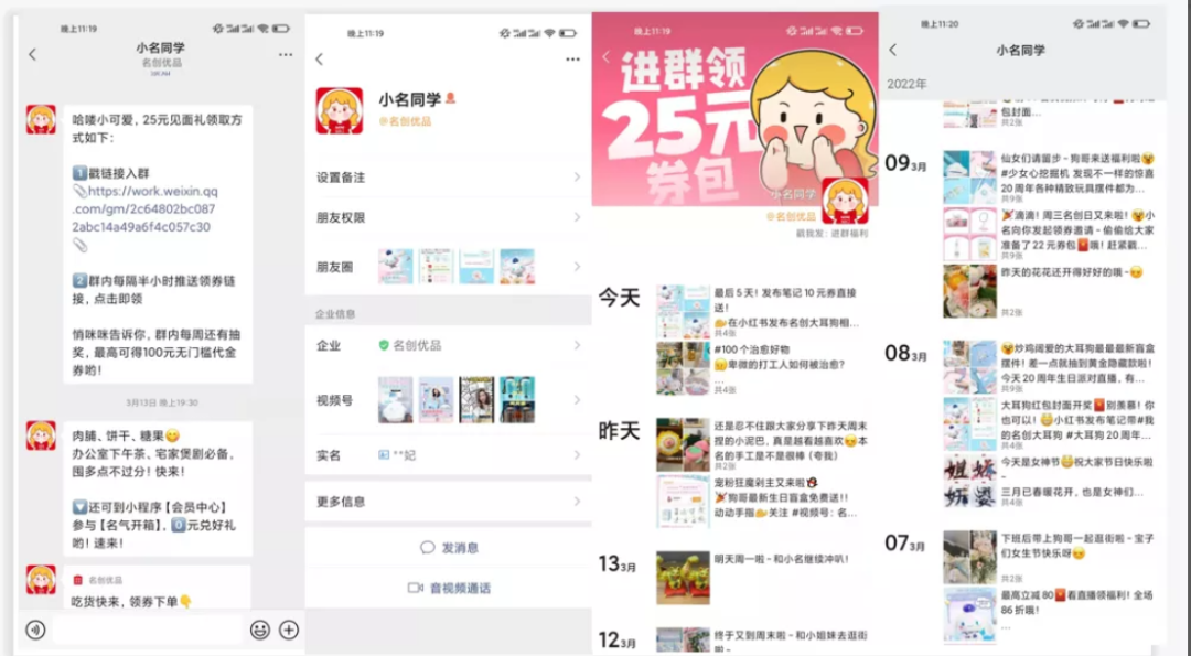 感觉朋友圈已经有比较成熟的SOP,每天都会有固定的内容输出,每周约14条朋友圈,朋友圈的内容主要是好物种草、专属福利、用户互动、日常生活4大类,通过高频弱打扰的方式潜移默化影响用户,打造一个有血有肉的福利官。