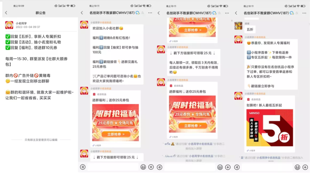 主要是告知社群的价值+社群的福利,并且领取社群福利的时候还会跟用户说千万别不舍得用,后续还有很多券,既可以当下引导用户使用产生购买还反复不断提醒用户社群的价值和意义,后面还有很多优惠券以及福利,让用户不要屏蔽社群,多来社群看看。