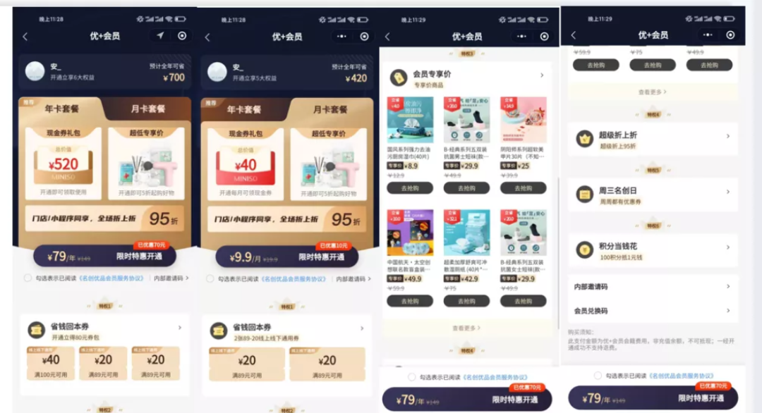 优+会员的两种套餐本质上都是用户通过付费向品牌购买相关权益,权益本质上只有2种,一种是领各种各样有门槛的满减优惠券,一种是打折,但是把折2种权益包装,让用户看起来看着权益很多很划算的样子;