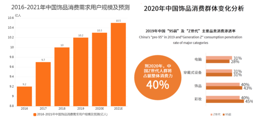 艾媒咨询数据显示,2021年中国饰品消费需求用户规模预计将达到10.5亿人次,市场规模达两千亿以上,且每年保持近20%的增长。而随着Z世代的到来,95后、00后逐渐占据饰品消费主力。