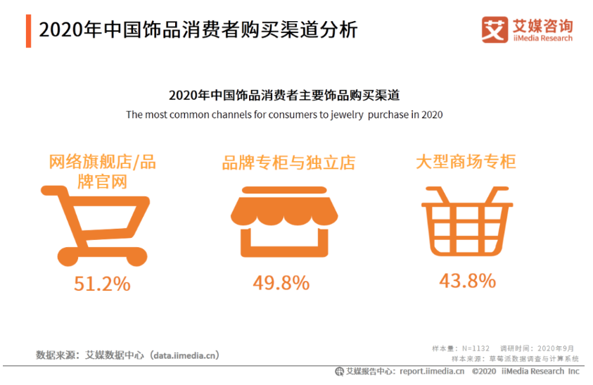 iiMedia Research(艾媒咨询)数据显示,中国消费者最常购买饰品的渠道中,网络旗舰店/品牌官网等线上购物颇受欢迎。