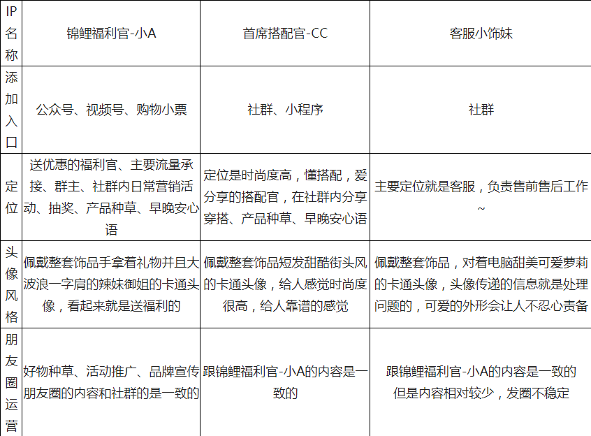 主要有3个IP人设,锦鲤福利官-小A、首席搭配官-CC、客服小饰妹,名称的命名格式是职责+名字,通过昵称告知用户不同人设的工作职能,传递了IP定位和品牌信息,