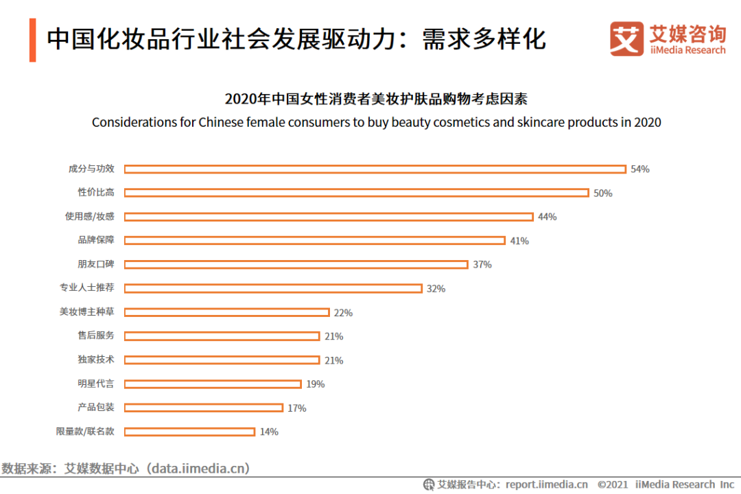 根据艾媒咨询数据显示,2020年中国女性消费者在购买化妆品时主要考虑成分与功效,性价比以及使用感/妆感,占比分别为54%,50%,44%。
