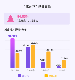 而这刚好和“成分党”的用户画像相吻合,根据《个推大数据:“护肤品成分党”人群洞察》的分析,成分党中女性占84.84%,其中中18-24岁群体逾5成。