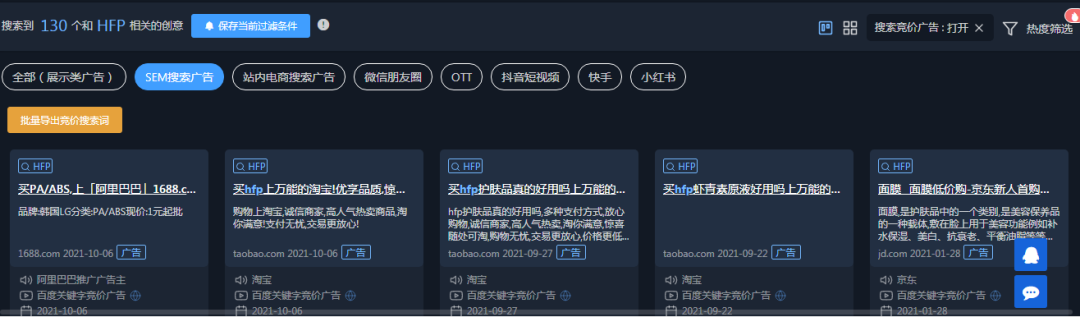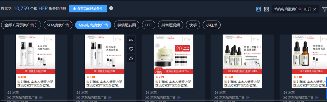 由此可见对于HFP的广告主要集中于百度关键字竞价广告和站内电商搜索广告,只要是通过广告引流至HFP的电商平台进行转化。