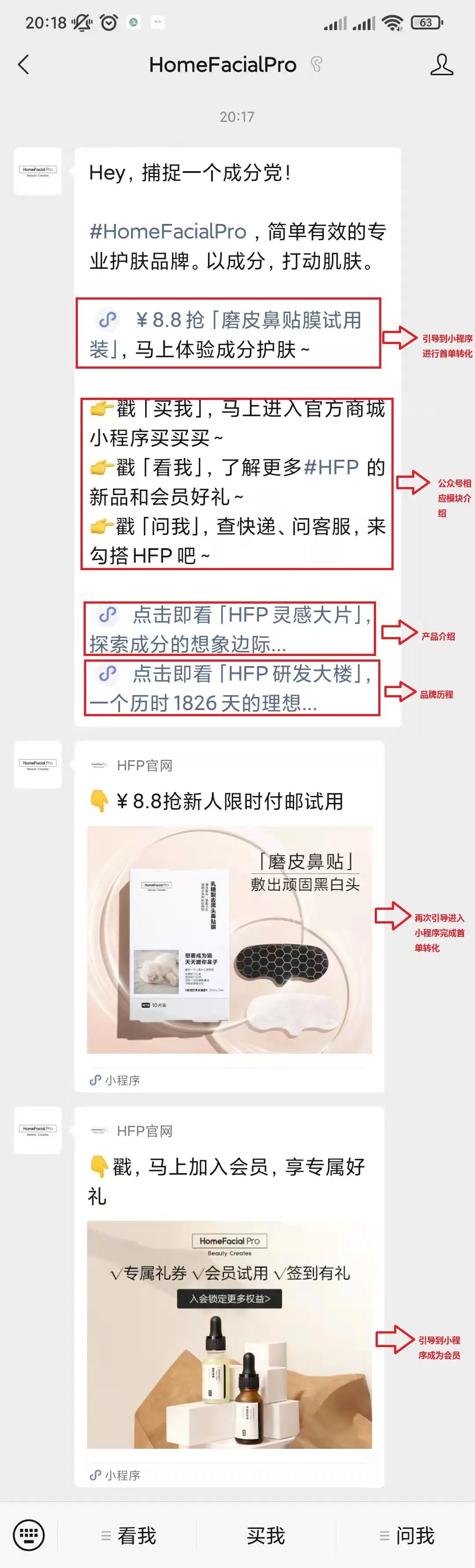 公众号是HFP主要承载流量的渠道,用户通过品牌投放的公众号软文关注公众号后,能够通过自动回复引导至小程序进行转化或注册会员。