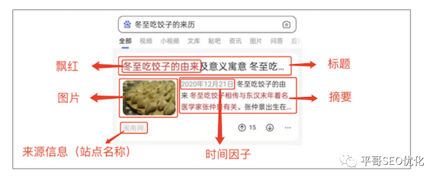 搜索基础展现主要包括五个部分:标题、摘要、图片、信息来源和飘红。