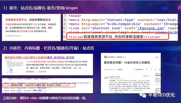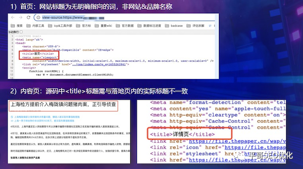 1)一致性:源码中<title>标题需与落地页内的实际标题一致。