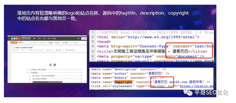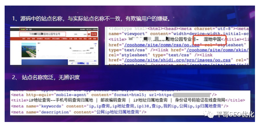 1)一致性:源码中的Tagtitle、Description中的站点名称应一致,且都与落地页内的实际的站点名一致。