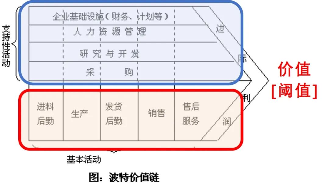 阈值思维篇提到,价值链分析模型是由著名的战略学家迈克尔·波特提出,它把"创造企业内外部价值增加"的活动分成基本活动和支持性活动。