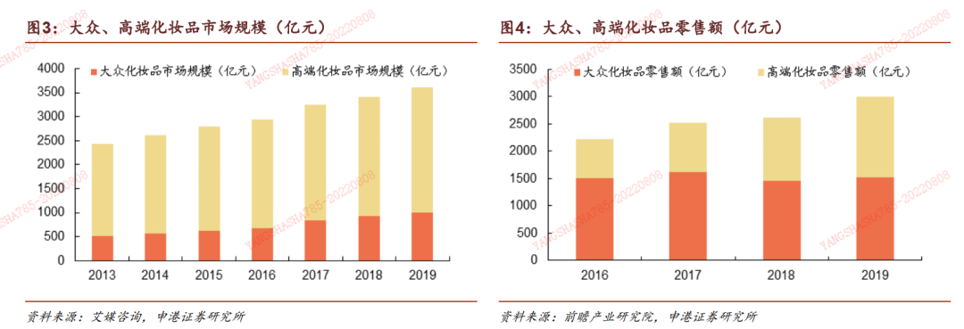 随着居民审美能力和消费水平的提升, 中国化妆品市场向高端化方向发展。 2019 年大众、高端化妆品市场规模分别为 1003、 2613 亿元,大众高端化妆品零售额分别为 1518、 1474 亿元。
