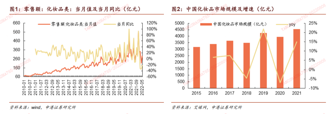 化妆品零售额增长,市场规模持续扩张。2010年以来,中国化妆品类零售额呈增长趋势。2010年1月,化妆品类零售额为70.2亿元, 2022年6月化妆品零售额424亿元,同比增长 8.1%,环比增长45.75%。2021年中国化妆品市场规模已达4553亿元,同比增长15.03%,且市场未达饱和,颜值经济驱动下增长空间大。
