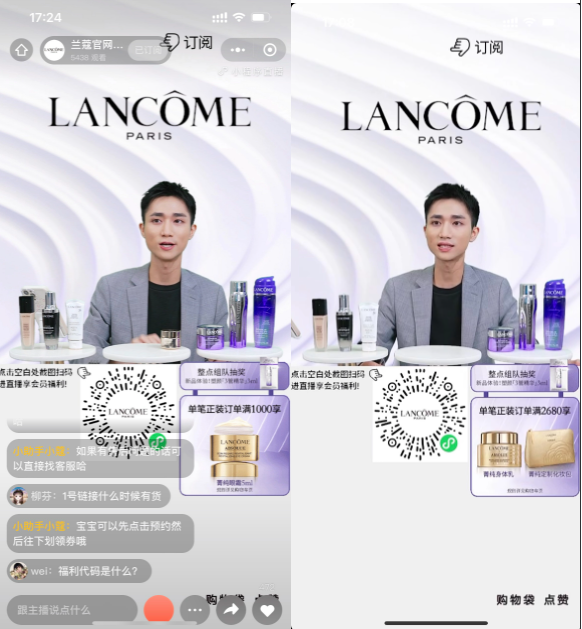 在直播时段点进去过几次,直播间的画风、调性、布置基本都是一样的,比如顶部展示直播主题、中间展示商城二维码、右侧有满赠活动轮播及整点抽奖预告,顶部指向关注视频号、对用户而言,能够降低理解和接受成本。购物袋和点赞的位置也用文字做了标注提醒。