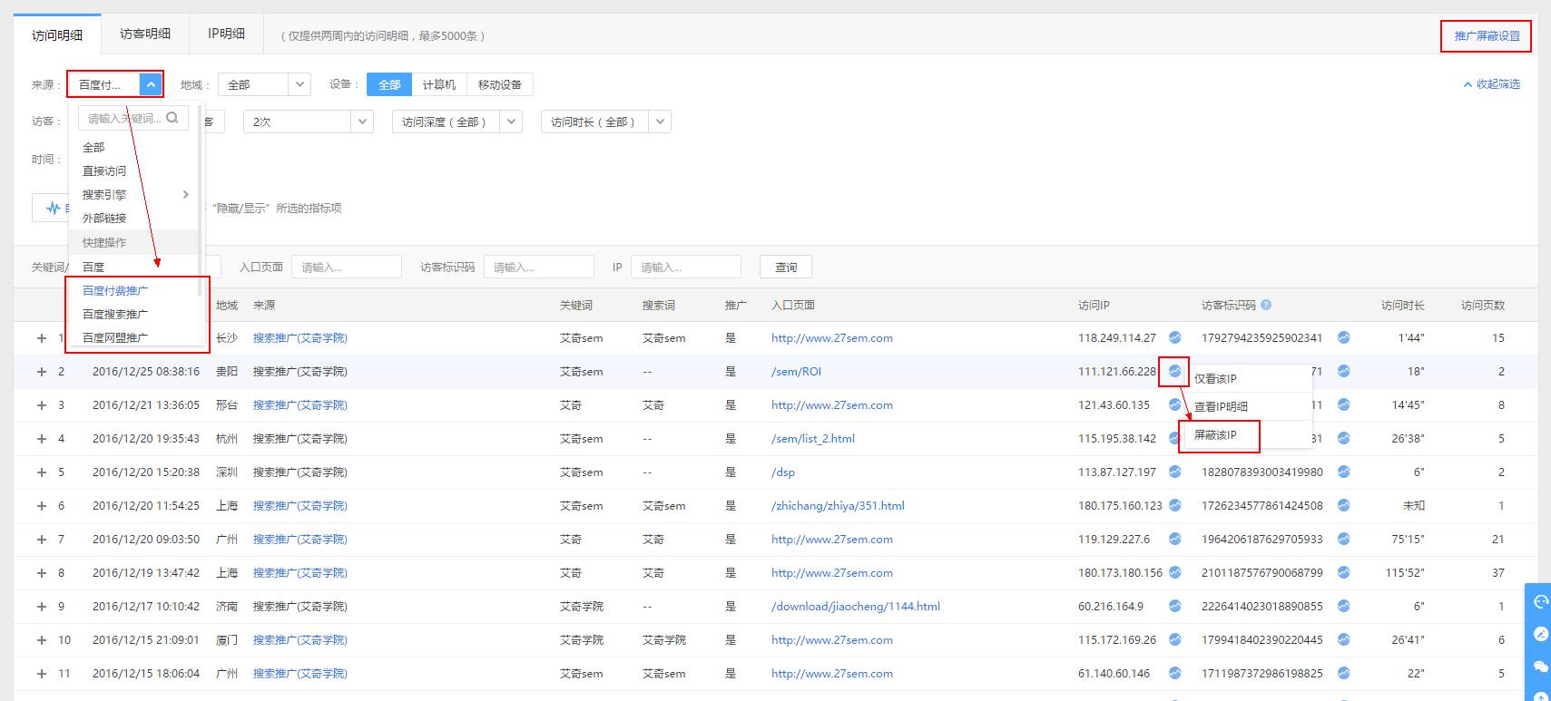 a.在【访客明细】或【IP明细】中,选择要屏蔽的访客,后续根据屏蔽码,对访客进行屏蔽。