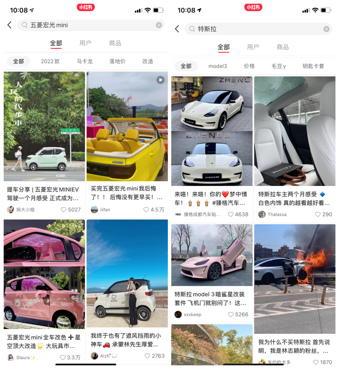 五菱宏光比特斯拉在小红书投放表现更佳。