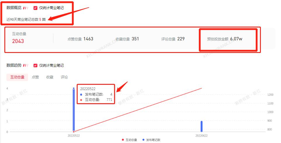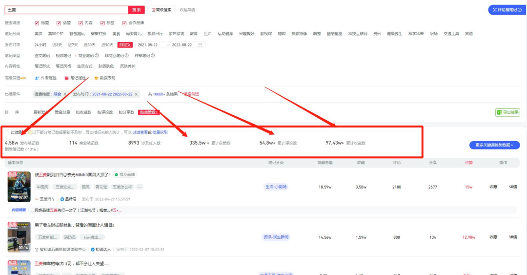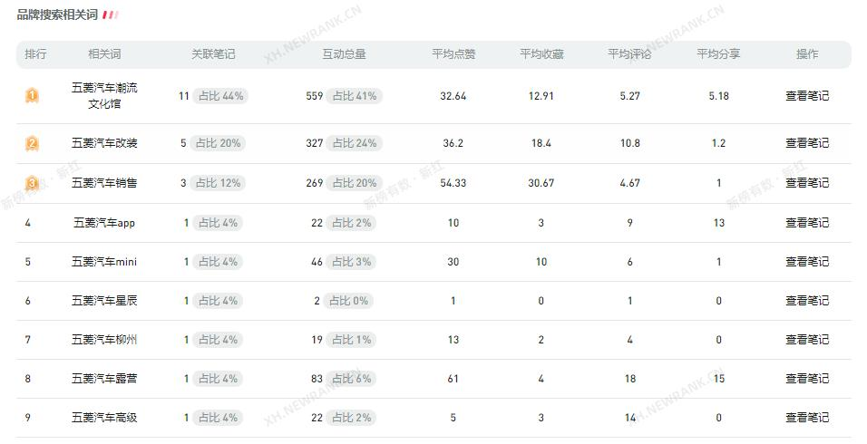 在小红书中,五菱汽车的达人投放相对较少,当然,不排除种草笔记中没有达人投放的可能性,没有走报备流程罢了。下图是五菱汽车的商业笔记数据 图以及投放笔记图,5篇笔记预估投放6.07w,平均下来一篇笔记的投放高达1w。