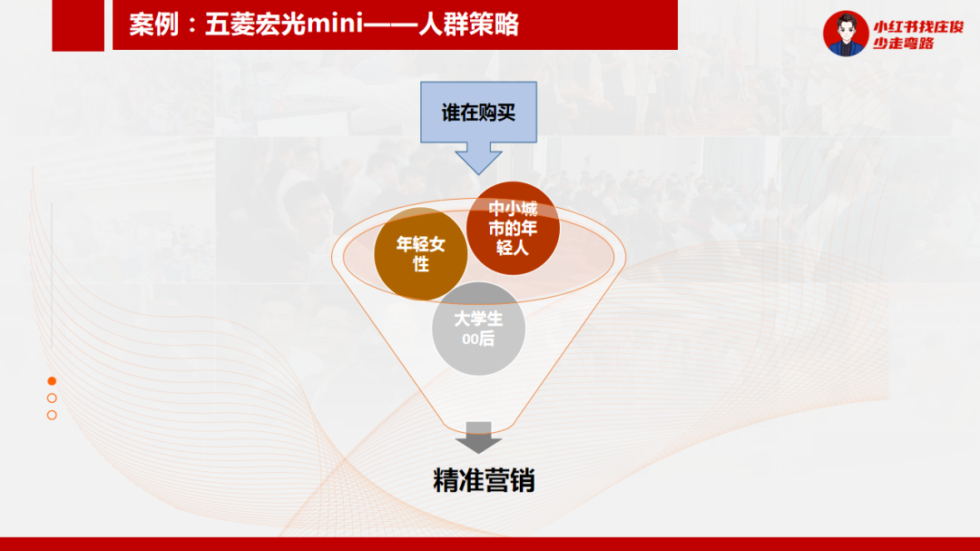 一是满足社交属性:促使很多女性买,而且车型像MINI 她们贴上可爱的卡通图案 比如皮卡丘、草莓熊,会激起年轻女性的社交欲,并且价格便宜,即使高配的也不会有很大的月供负担。