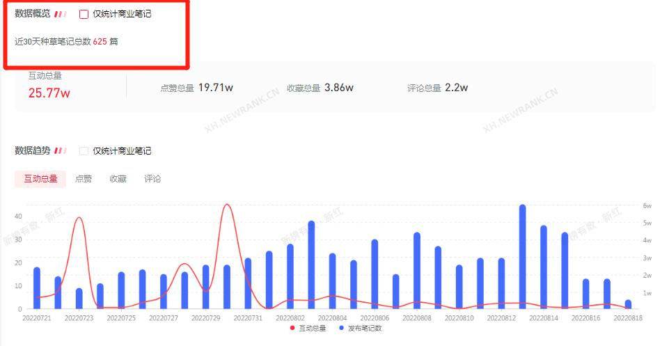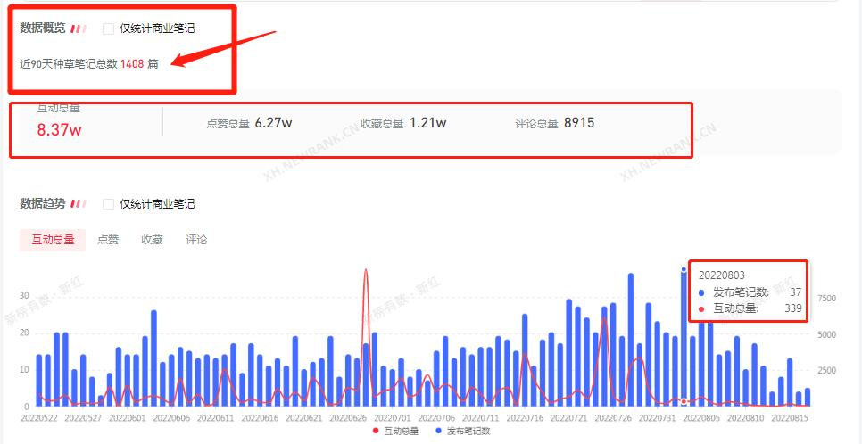 五菱汽车近90天内所有投放笔记是1408篇,其中,商业笔记仅占5篇,商业笔记占比率低于3%,上图看到,关于五菱汽车的笔记每天都保持在15篇以上,笔记数量最多的一天是8月3号,也就是这个月初,日发布笔记高达37篇,基本上都属于种草笔记。