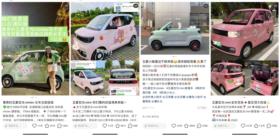 五菱汽车的账号除去专业号有近百个账号在同时运营。回到专业号中,笔记方向大致以汽车外形、配色、以及关于五菱MINI 性能相关的笔记围绕展开,通过外观的形式吸引现代年轻女性和00后。