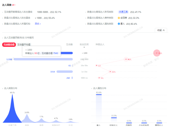 五菱宏光汽车达人多数在<1000之间,占比55.6%,其余达人粉丝数量在1w-5w之间,占比52.1%,互动量较多的集中在1w-5w粉丝之间。素人较多,占比82.6%,其次是初级达人,占比15.5%,五菱汽车中的达人80占比都在初级达人以下。