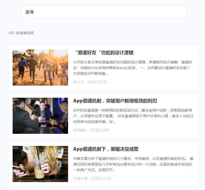 以人人都是产品经理搜索为例,490篇文章涵盖二维码、邀请码、链接分享等多种邀请类型,但所有指向的邀请形式都是简单粗暴的:老用户邀请-新用户注册-双方奖励;奖励形式基本以现金红包、优惠券、产品积分(豆或币)等附加值刺激。
