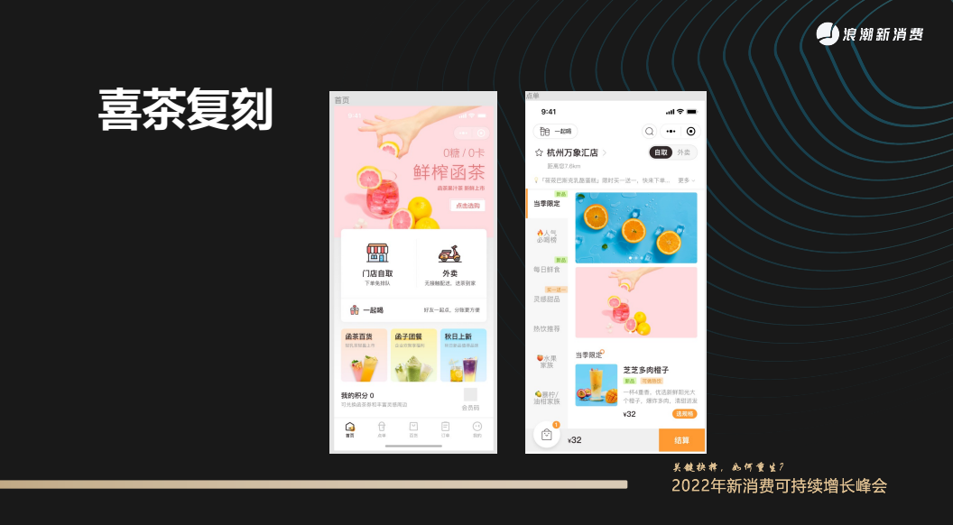 喜茶也是在传统奶茶行业走出的先锋型品牌,它第一次把品牌DTC的数字化概念引入到整条业务线里面。其中非常有代表性的就是小程序,给他们的运营带来了很大的效率提升。