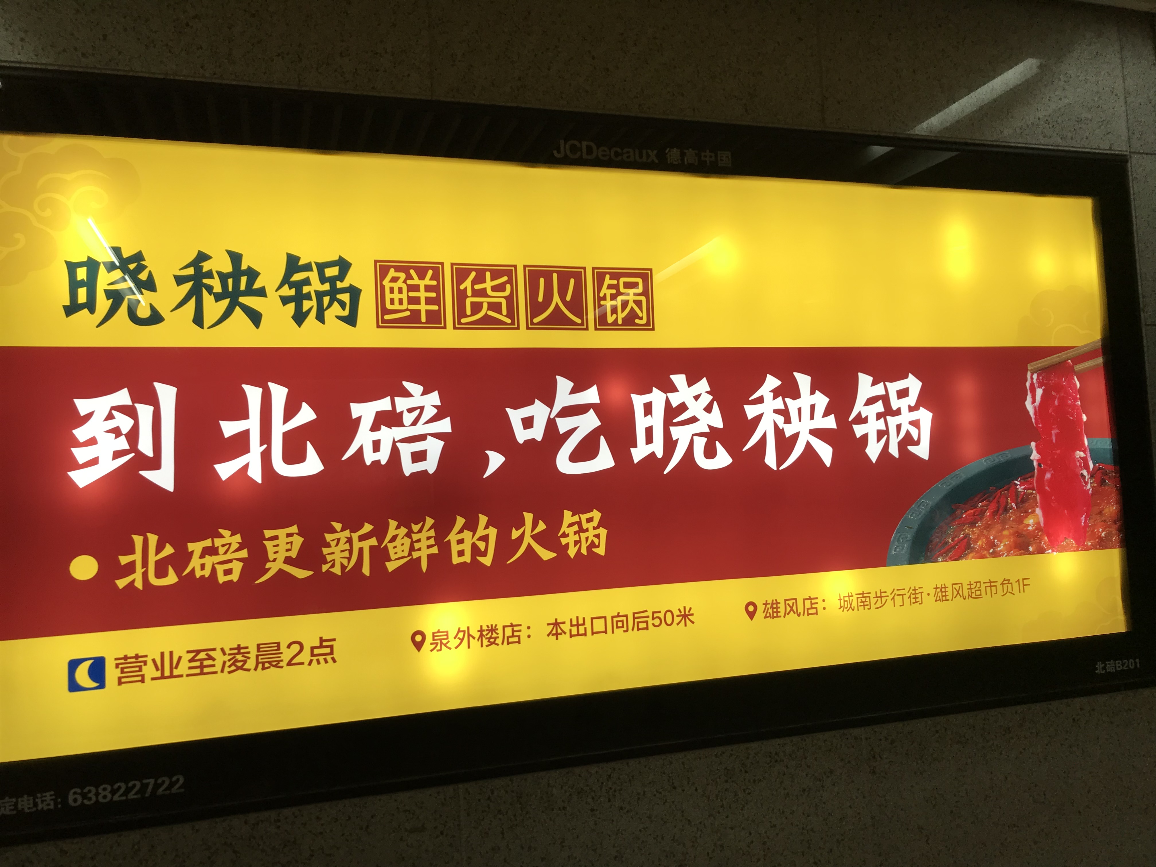 一句简单的话,却很能说中目标消费者的需求,在非常短的时间之内向行人概括了自身产品的特点。同时,要注意的是这则广告是被投放在成都、重庆的地铁里,切合当地人的饮食消费习惯。这样的场景化是线下广告值得去设计的地方。