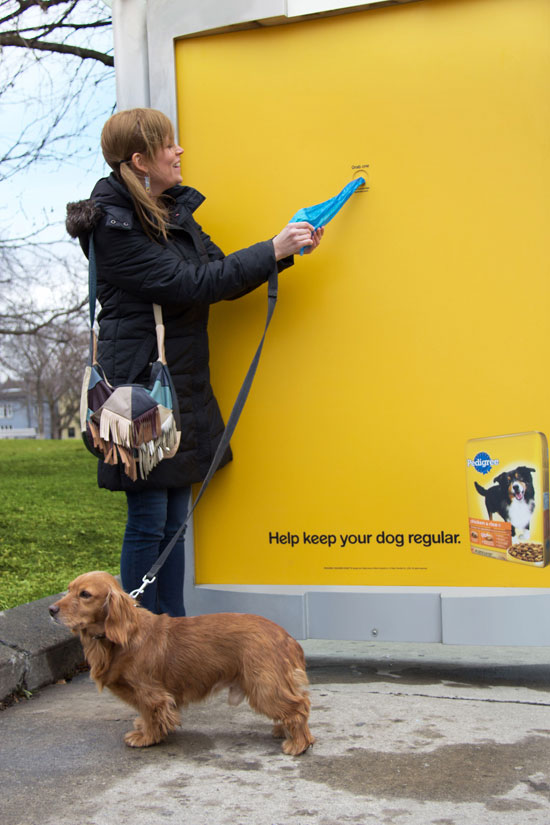 在纽约的街头就不时可以见到这样的创意,比如:利用周边建筑环境绘制出来的啤酒广告,可以和屏幕进行互动的路边电子屏,还有可以扯出塑料袋的实用贴心的狗粮广告。