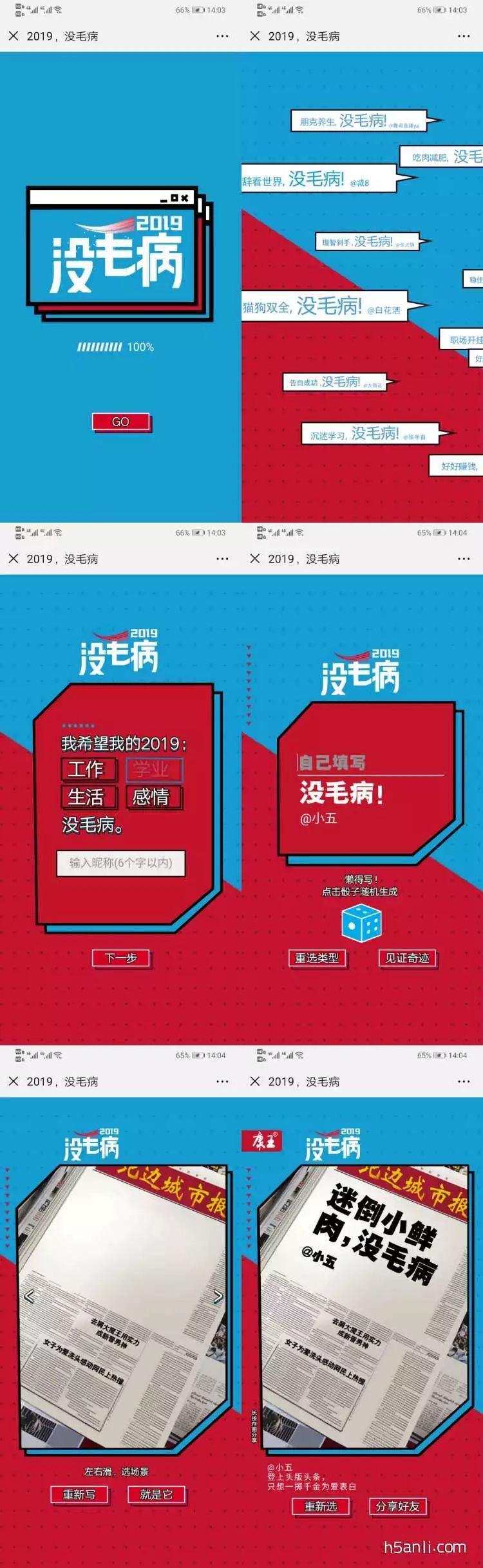 选一个自己希望没毛病的方面,输入自己的名字,会生成关于这一问题的好消息页面。同风格的海报,也在强调“2019 没毛病”: