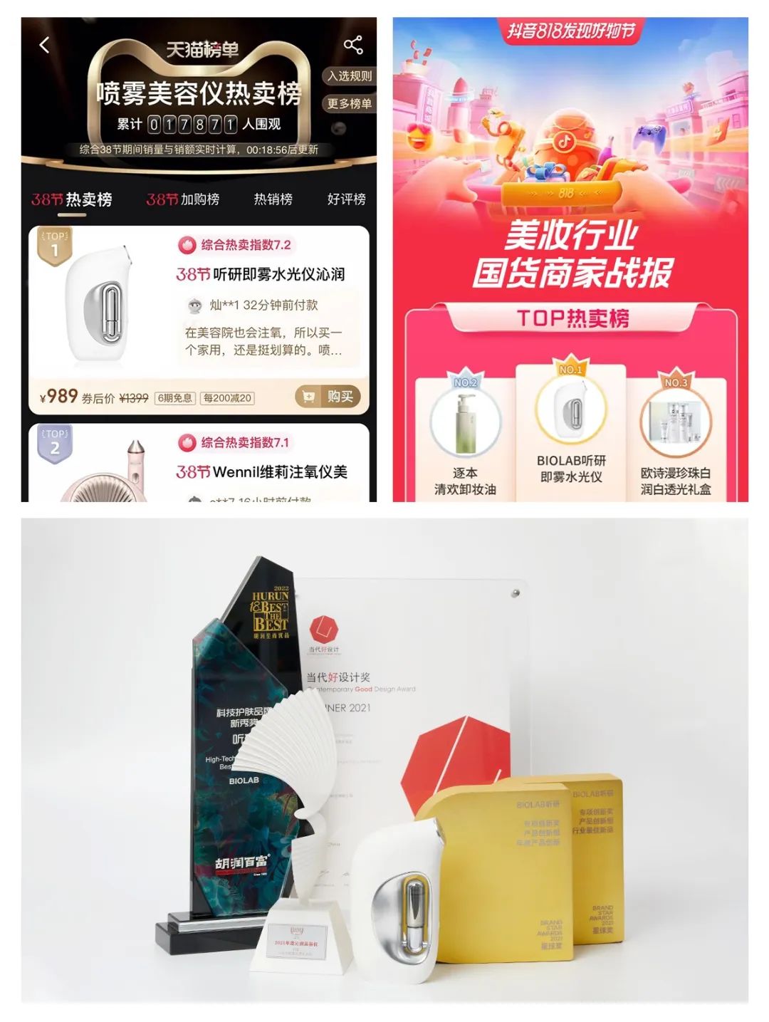 上市短短1年内,荣获《时尚芭莎》、抖音电商《大美星品》、天猫《喷雾美容仪》TOP1、德国红点奖旗下《当代好设计》等多个榜单荣誉;更是一度因热卖而售罄。
