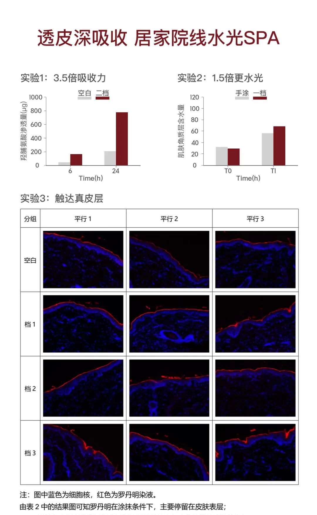 同时,即雾水光仪还能搭配不同功效的精华液,雾化精华细至0.01mm,轻松触达皮肤真皮层(1),对比用手涂抹精华可以高达3.55渗透力(2),24小时持续作用于皮肤深处(3)。
