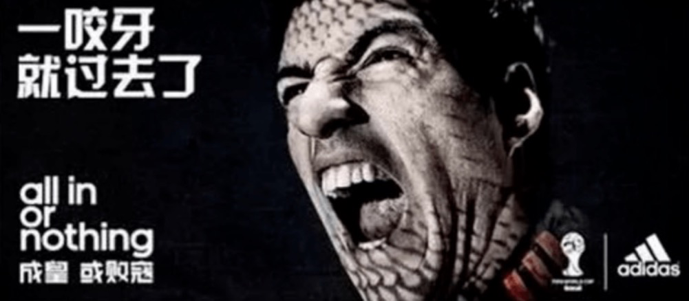 2014年巴西世界杯小组赛,意大利对阵乌拉圭的比赛中,乌拉圭队的苏亚雷斯在拼抢中咬了意大利后卫基耶利尼,也成为那年的世界杯“名场面”,阿迪达斯在当天发出了“一咬牙就过去了”的社交网络海报,虽然最终以引发负面删除告终,但比赛中突发出人意料事件引发的流量,不得不让人咋舌。