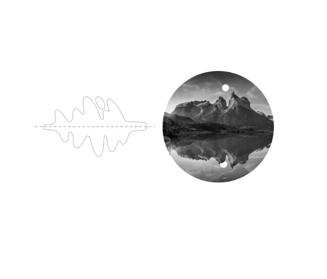 标志横放,则化为自然能量场,仿佛山在水中的倒影,也仿佛溪流蜿蜒的曲线。此时再看,树旁的一点和树形整体的关系,就如同人类和自然,相互分离又共为一体,象征着人与自然的动态平衡。