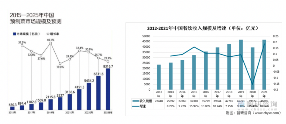 从以下预制菜的相关研究数据中,我们也可以清晰的看到,预制菜的市场规模及预测呈现高速增长之态,其前景广阔,极具想象空间。