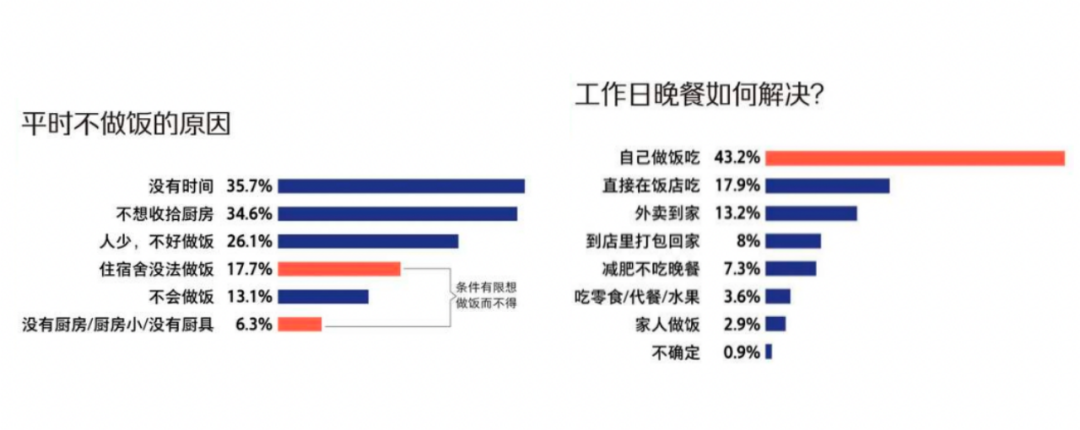 背后的原因有很多:或是没有食材购买处理时间,亦或是没有足够的进行饭前和饭后的收拾“残局”兴趣,以及当下的生存压力让他们无法拥有足够施展的厨房等原因,都导致很多年轻人选择更简便的外出进餐或购买“送货上门“的预制菜。