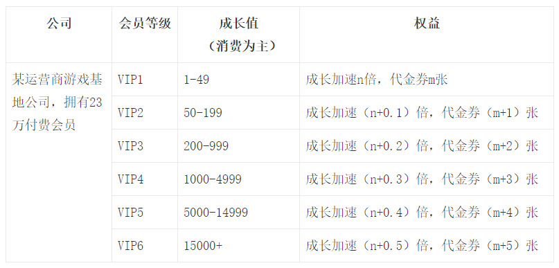 举例:某运营商下属游戏基地公司,截至到18年,累积拥有23万付费会员,平台以”消费金额“为核心权重,将会员进行6个等级的划分,不同等级会员享受不同的会员权益。