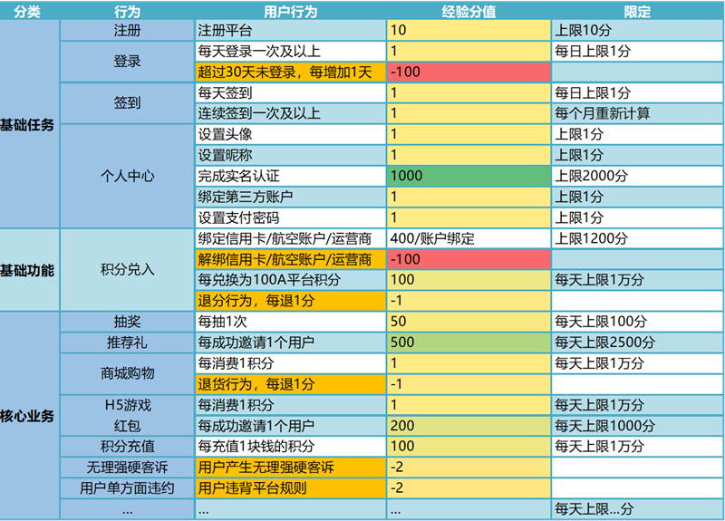 平台当时对用户的核心诉求为:消费+活跃,遂按照重要性罗列出如下权重:消费、兑入运营商&银行&航空积分、签到、登陆、参与平台活动。