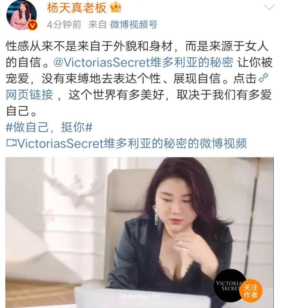 2021年5月,维密又请杨天真代言,品牌诉求直接叫做“做自己”,文案中有“性感从来不是来自于外貌和身材,而是来源于女人的自信”这样的话语。